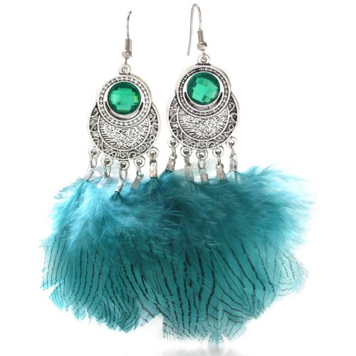 SuperJeweler , These Aztec inspired green and black pinstripe feather earrings are truly one of a kind. Earrings feature ten green and black striped feathers and two pine green circular stones! Earrings are four inches long.